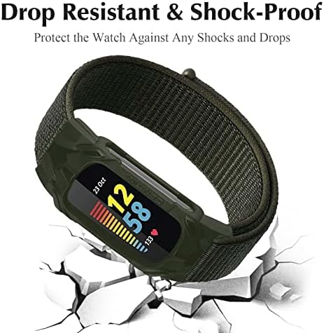 2-in-One Nylon Sport Loop Band with Case Only Compatible with Fitbit Charge 5 Bands, Hook & Loop Braided Strap with Shockproof Rugged Bumper Cover Screen Protector for Women Men, Army Green