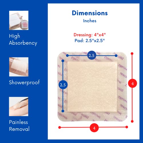OPTIMAL HEALING: High Absorbent 4×4 inch Dressing (2.5”x2.5” Pad) with Advanced TekSil Technology, One Dressing Lasts Up to 7 Days