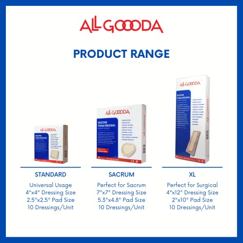 ALL GOOODA Silicone Foam Dressing 4”x4”[10 Pack] Gentle Adhesive Border for Wound Care, Sacrum, Sacral Foam Dressing, Bed Sore, Pressure Sore, Leg Ulcer, Diabetic Ulcer, Large Wound Bandage