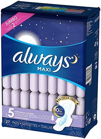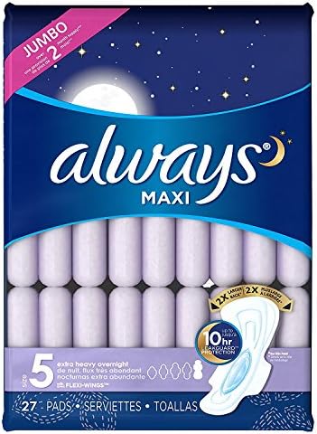 Includes: (2) 27-Count Packages of Always Maxi Size 5 Extra Heavy Overnight Pads With Flexi-Wings. (Includes 54 pads total.) Jumbo Pack. Over 4 Month Supply. Are you getting the right protection from your pad… Using the wrong pad size can lead to leaks. Step up in size to help stop leaks. For overnight protection, Always Maxi Size 5 Extra Heavy Overnight Pads With Flexi-Wings have a 2X larger back to help stop leaks at night, plus a LeakGuard Core that absorbs in seconds and gives you up to 10 hours of protection. Features: >>> 2X larger back to provide better coverage for our best overnight protection. (Vs. Always Maxi Regular with wings.) >>> LeakGuard Core absorbs in seconds for up to 10 hours of protection. >>> Flexi-Wings Flexible Design. Always Maxi, Size 5, Extra Heavy Overnight Pads With Flexi-Wings have a flexible design for our best nighttime protection. >>> GREAT GIFTABLE IDEA FOR WOMEN. >>> Customer Reviews: “Confidence. I love this product, it makes me feel protected, comfortable and confident. I don’t have to worry about accidents or not enough coverage. I highly recommend the always maxi pads overnights is definitely a must have.” “I love these. Only pads I buy.” “Can’t Feel a Thing. I love-love-love these pads. Because I’m at perimenopause, I tend to get ‘dry,’ and tampons aren’t as comfortable as they used to be. There is also not really a way of predicting how heavy or how light my flow is going to be. I decided to give Always pads a try. I am more than protected when I wear them, and am very pleased with them.” “Always the best. There is no doubt that Always brand products are the best when it comes to ‘that time of the month’.” >>> Made by Procter and Gamble. UPC: 037000889304. >>> 30 DAY GUARANTEE. Go ahead and make the decision to order now. There is zero risk for you. Your purchase is backed by Amazon.com’s 30 Day Guarantee. “Items shipped from Amazon.com can be returned within 30 days of receipt of shipment in most cases.”