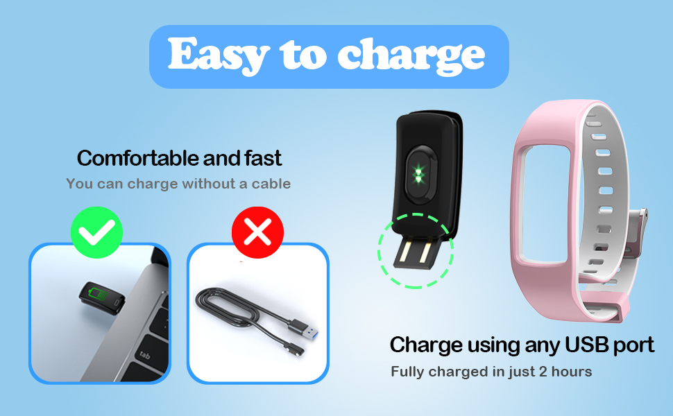 💌Smart watch tracker compatible with iPhone and Android Phone,compatible with most iOS 9.0 & Android 5.0 above smart phones,smart band Information notification bracelet will vibrate to remind you,Include SMS,Twitter,Facebook,Skype,Instagram,WhatsApp,etc.not support answering hanging up calls and sending messages.easy charging,from “OPEN” sides pull out the strap which is below the touch key, you will see the built-in USB plug with metal pins.Insert the metal pins into any USB port/Wall charger.