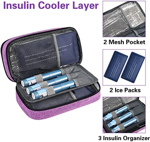 Insulin Cooler Travel Case,Double Layer Diabetes Bag Organizer for Women with 2 Ice Packs, Diabetic Supplies Pen Case with Medication Storage Pockets for Insulin Pens, Blood Glucose Meter, Purple