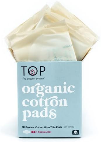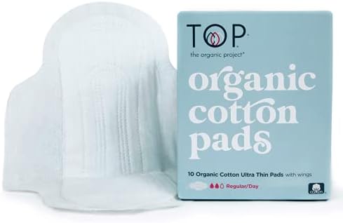 TOP: Certified Organic 100% Cotton Ultra Thin Regular (Day) Absorbent Pads w/Wings | Non-Toxic, Biodegradable (Natural Sanitary Napkin, Breathable, Unscented, Feminine Hygiene), 10 Ct